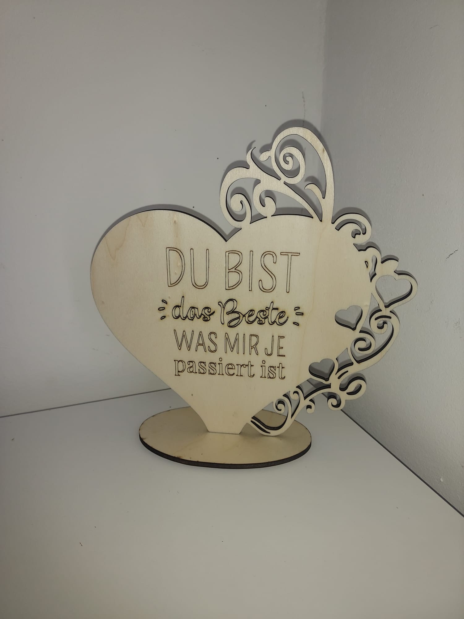 - Herz-Aufsteller aus Sperrholz (4mm) mit dunkler Lasergravur und dunklen Laserkanten