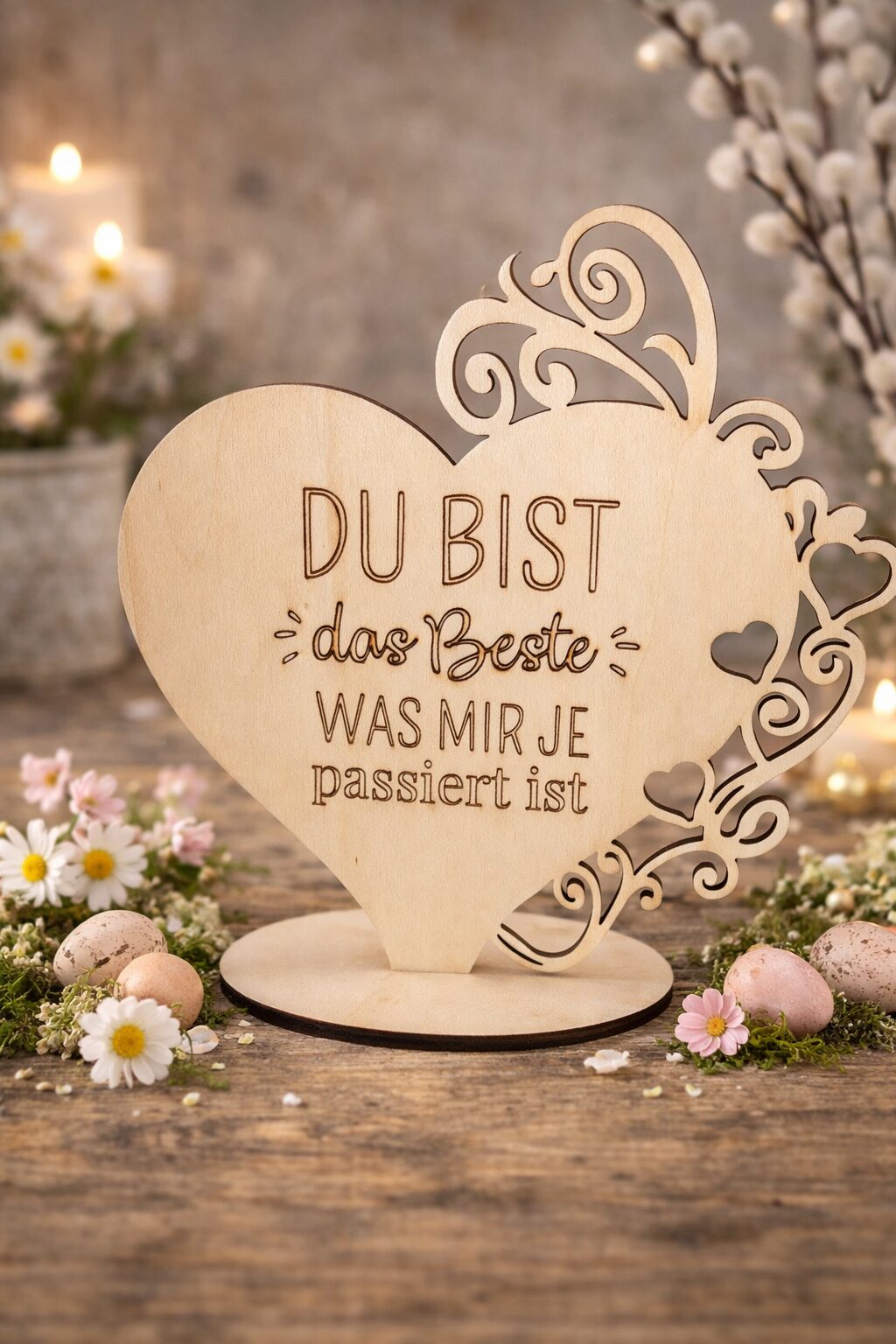 Dieser dekorative Holzaufsteller in Herzform ist mehr als nur ein kleines Geschenk – er ist eine kleine personalisierte Aufmerksamkeit für den Lieblingsmenschen. Die filigranen Ornamenten und der gravierte Schriftzug macht ihn zu einem schönen Blickfang auf Regal, Kommode oder Schreibtisch.