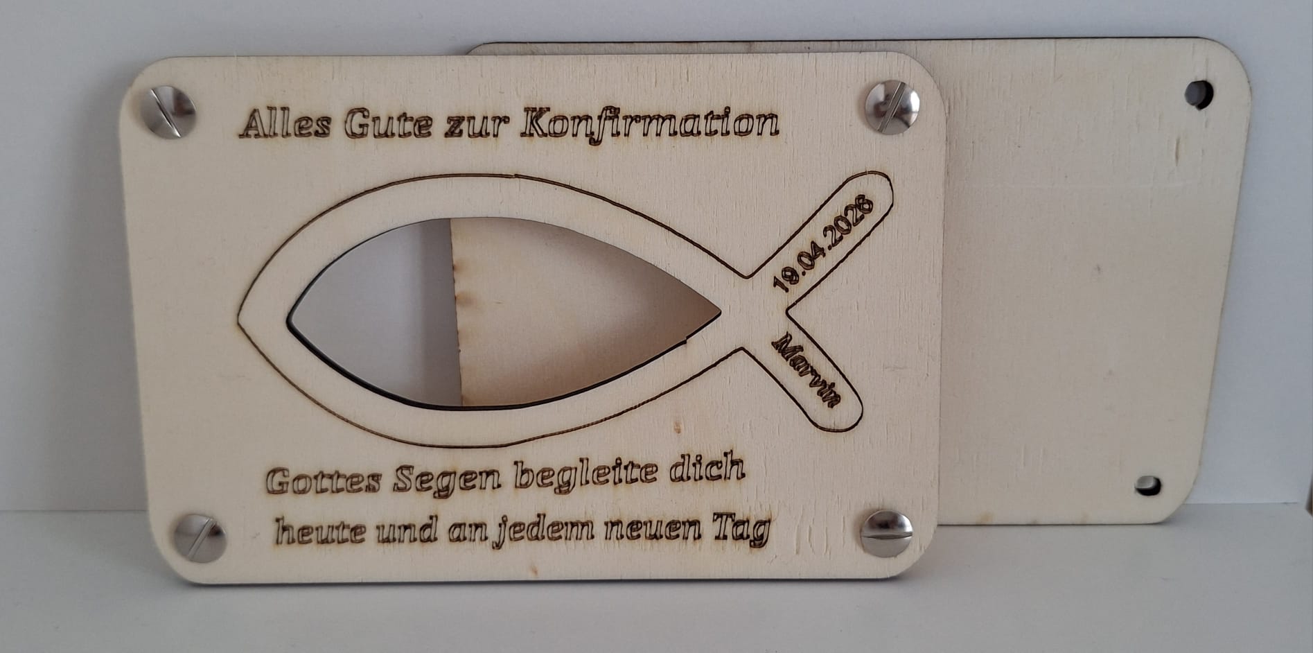 Personalisierung: Die Fischflosse ist mit einer Gravurzone für das Datum und den Namen des Konfirmanden versehen (Beispiel: „19.04.2026 Marvin“). Dies macht das Geschenk zu einem unverwechselbaren Unikat.
