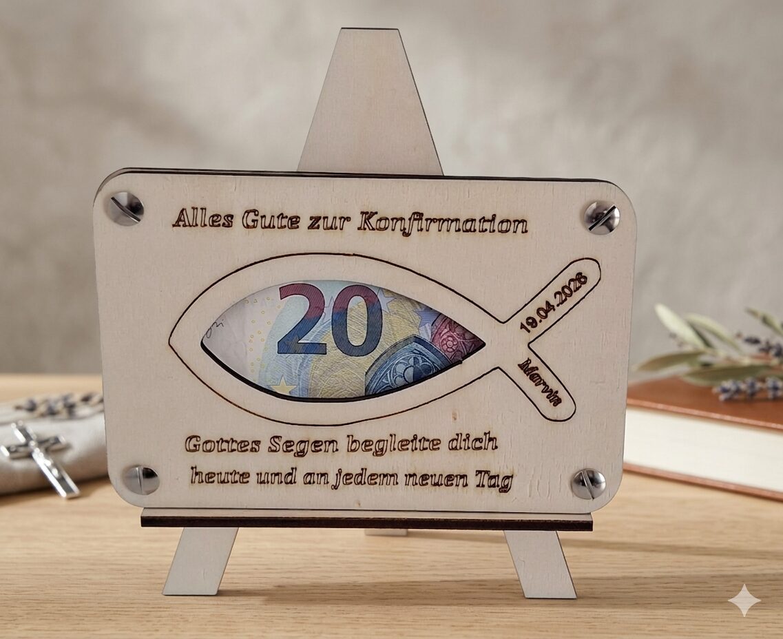 Machen Sie die Konfirmation zu einem unvergesslichen Moment mit diesem Geldgeschenk-Halter. Anstatt eines einfachen Umschlags präsentieren Sie Ihr „Mitbringsel“ als Dekorationsobjekt auf einer Miniatur-Staffelei.