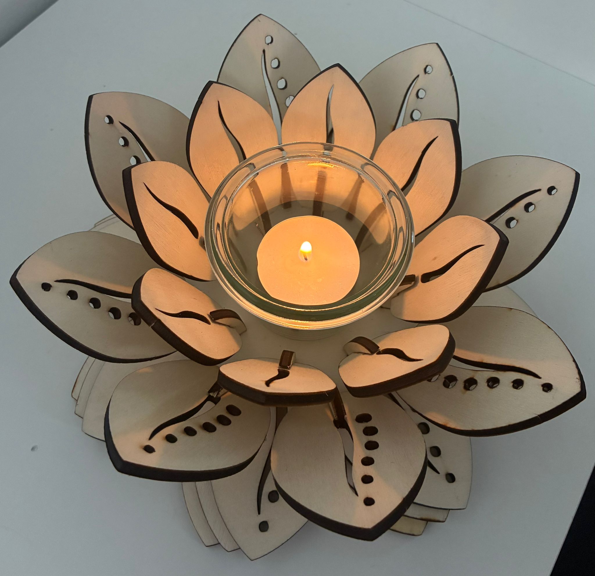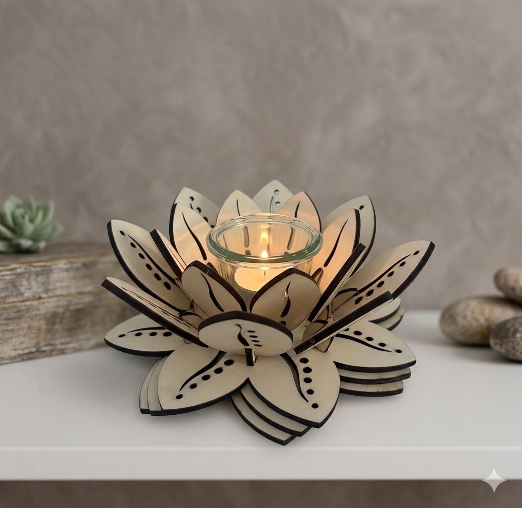 Dieser gefertigte hölzerne Teelichthalter in Lotus-Optik schafft durch sein florales Design und das warme Kerzenlicht eine beruhigende, meditative Atmosphäre in jedem Raum.
